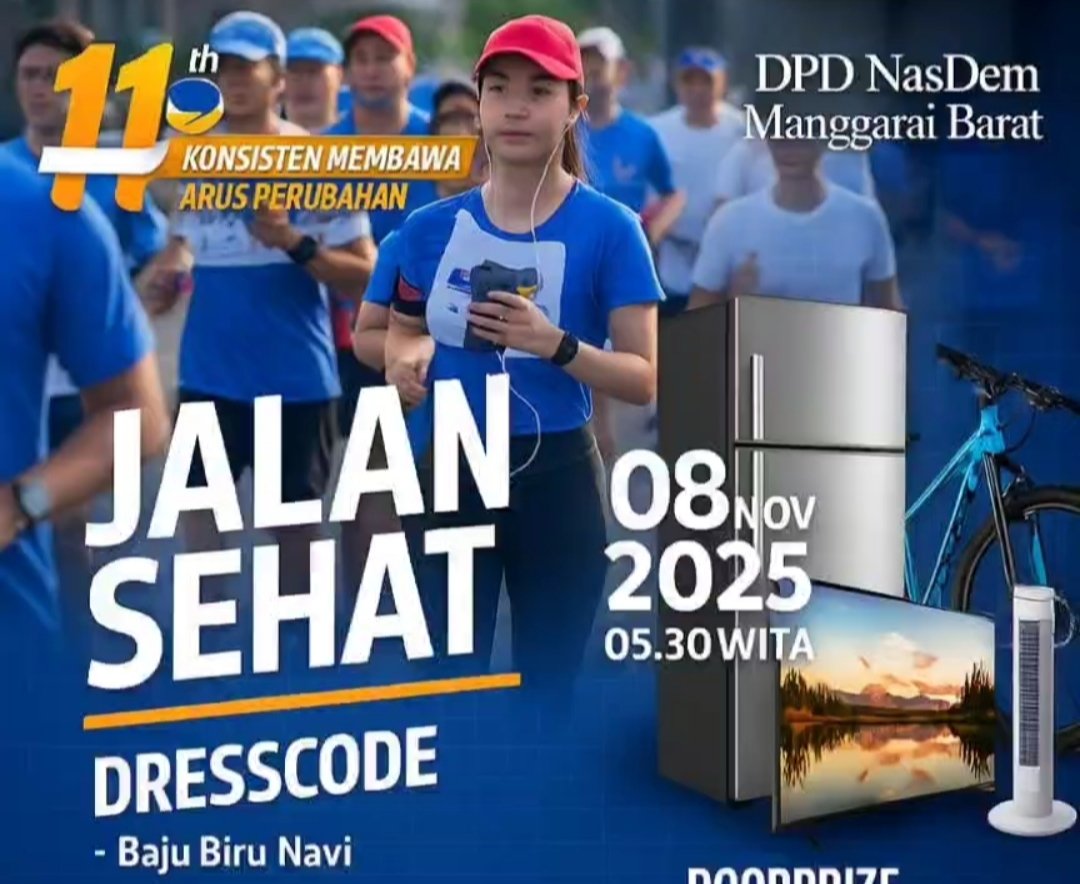 Medialabuanbajo.com,- Dewan Pimpinan Daerah (DPD) Partai NasDem Kabupaten Manggarai Barat, akan menggelar jalan sehat berhadiah di Labuan Bajo pada Sabtu 08 November 2025 mendatang.