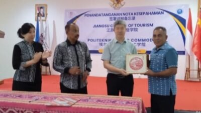 Seremonial penandatanganan MOU kerjasama internasional antara Politeknik el Bajo Commodus dengan Delegasi JSCT Cina, di aula Politeknik El Bajo Commodus Kamis (06/11/2025).