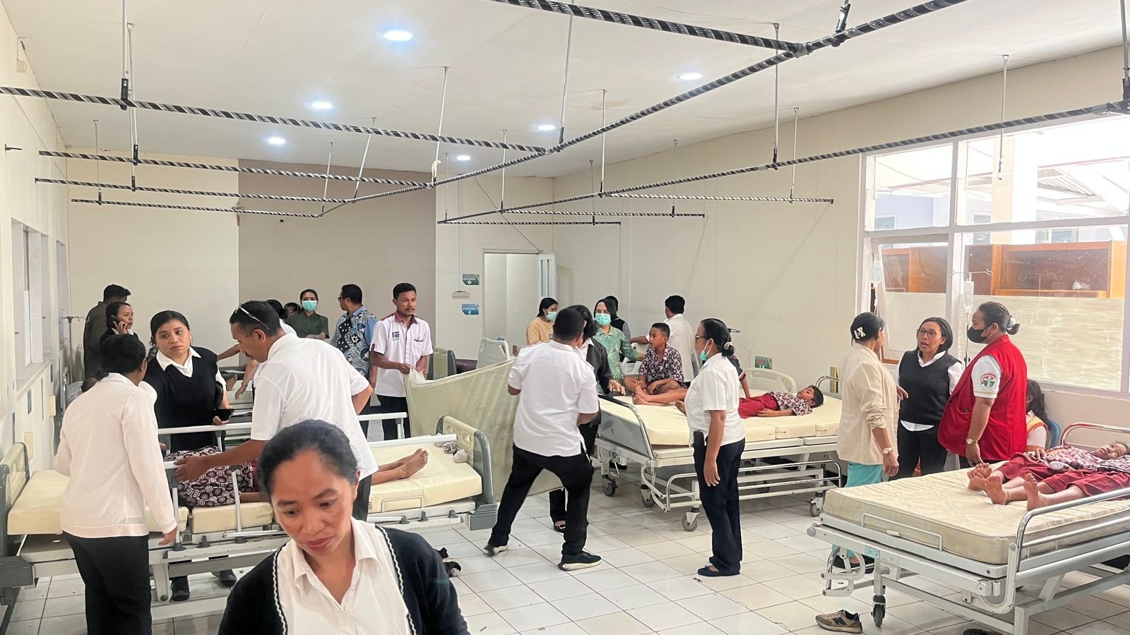 Tampak petugas medis kewalahan menangani anak yang mengalami pusing dan kejang. Anak-anak ini juga tidak mampu menahan rasa demam tinggi.