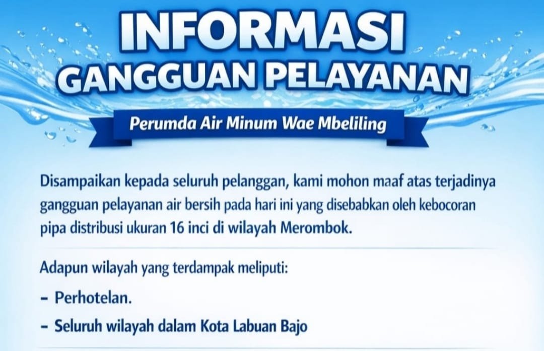 LABUAN BAJO – Masyarakat Kota Labuan Bajo nampaknya harus kembali mengelus dada. Penyakit kronis yang melanda Perumda Air Minum Wae Mbeliling kembali kambuh. Melalui pengumuman yang sudah dianggap “basi” oleh warga, perusahaan pelat merah ini kembali menginformasikan gangguan layanan akibat kebocoran pipa di wilayah Merombok.